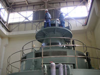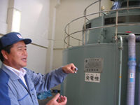 | これは発電きです。水をこの中に通してきかいを回転させて電気を 作ります。 | |